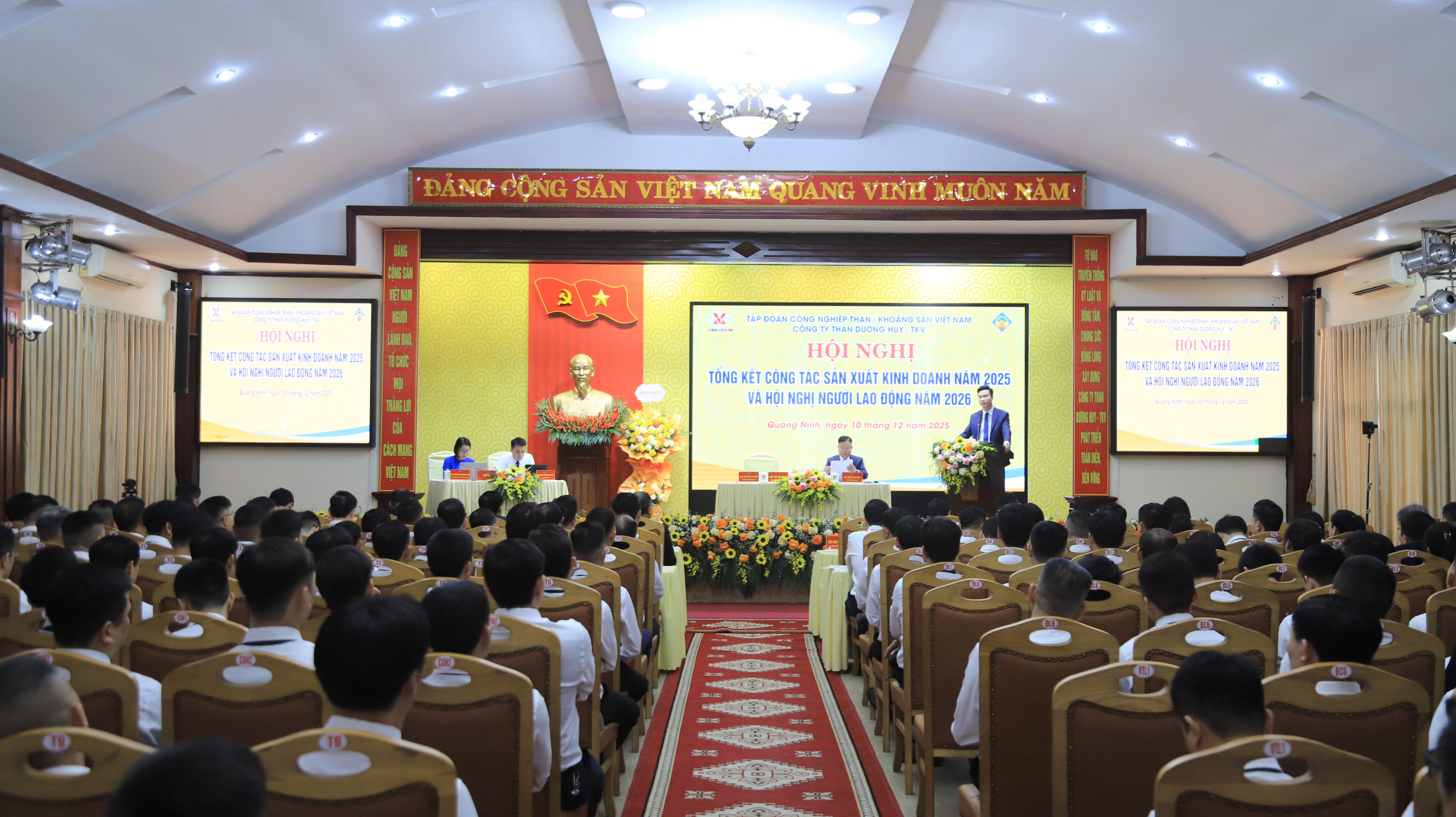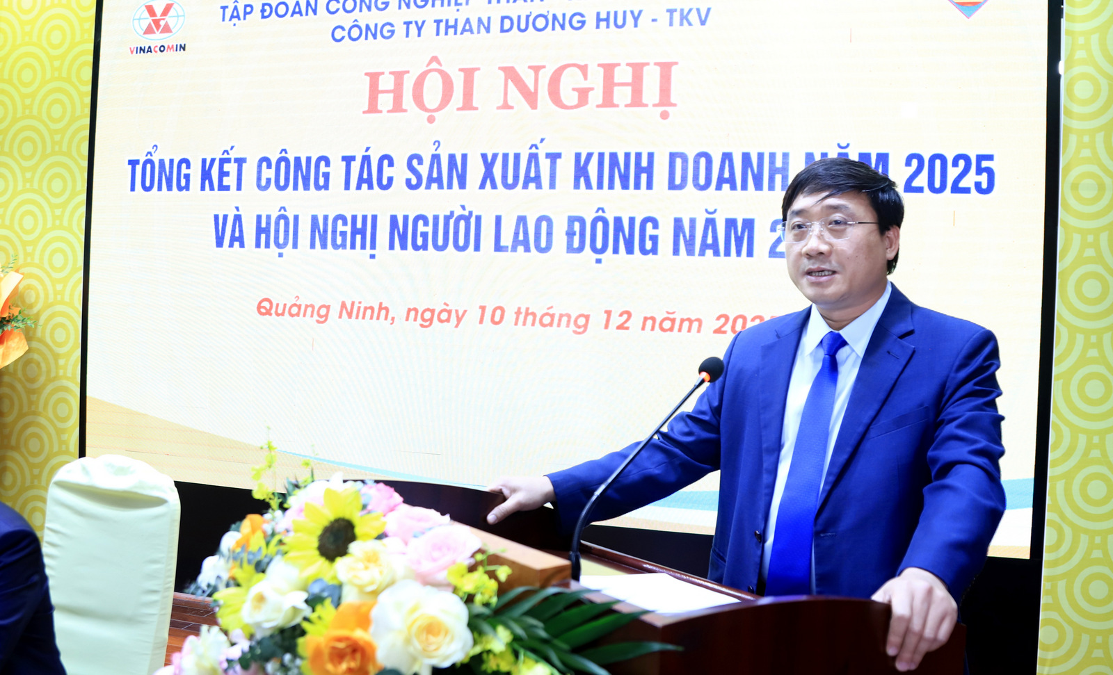 Phát biểu chỉ đạo tại Hội nghị, đồng chí Phan Xuân Thủy – Phó Tổng Giám đốc Tập đoàn TKV đánh giá cao, ghi nhận và biểu dương một năm hoàn thành xuất sắc toàn diện mọi nhiệm vụ của Than Dương Huy và đề nghị: Năm 2026, Công ty cần tập trung chỉ đạo quyết liệt 09 nhóm giải pháp trọng tâm để duy trì công suất thiết kế mỏ 2,5 triệu tấn hầm lò trong nhiều năm tới; Tăng cường quản trị rủi ro trong công tác quản lý để đảm bảo hiệu quả sản xuất kinh doanh; Tích cực triển khai Đề án chuyển đổi số, đẩy nhanh tiến độ phương án xuống sâu, tiết kiệm chi phí sản xuất trong giai đoạn chuyển giao giữa 2 tầng -100 và -250. Đặc biệt quan tâm cải thiện điều kiện, môi trường làm việc, đảm bảo an toàn để thu hút giữ chân người lao động; Tiếp tục duy trì đoàn kết nội bộ, phát huy truyền thống văn hóa thợ mỏ “Kỷ luật và Đồng tâm”, chăm lo đời sống người lao động chu đáo trong dịp Tết sắp tới, tạo nền tảng vững chắc khẳng định uy tín vị thế một Công ty sản xuất than hầm lò lớn của Tập đoàn TKV.
